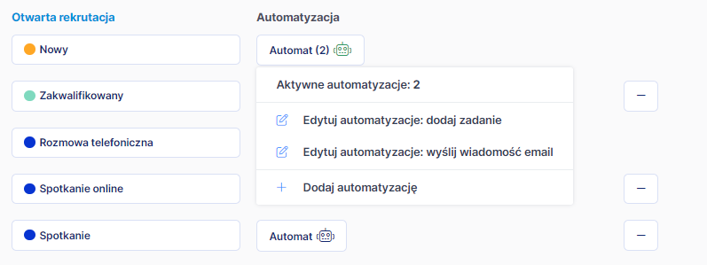 Automatyzację można dodać tworząc lub edytując rekrutację w zakładce . Przy wybranym etapie należy kliknąć w ikonę Automat, a następnie .