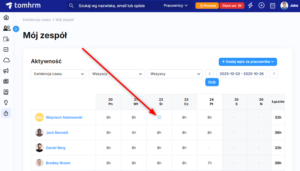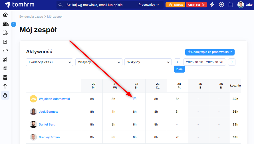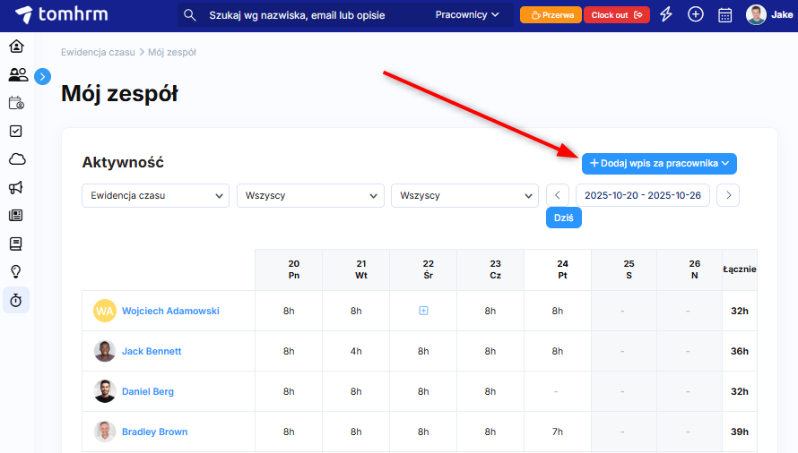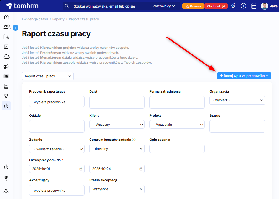 Jeśli przełożony/kierownik projektu/kierownika zespołu/osoba zarządzającą działem ma włączony dostęp do raportów, może również dodać czas z poziomu – jak administrator, co jest szczególnie przydatne w sytuacji, gdy należy dodać wpisy zbiorczo.