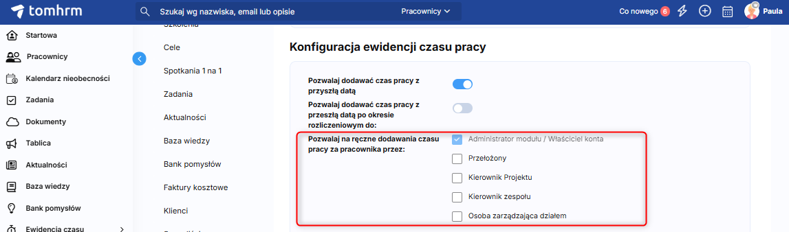 Zarządzanie funkcją dodawania czasu pracy za pracownika jest dostępne w zakładce: W tym miejscu zdecydujesz, kto może mieć możliwość dodawania ręcznie czasu za pracownika.