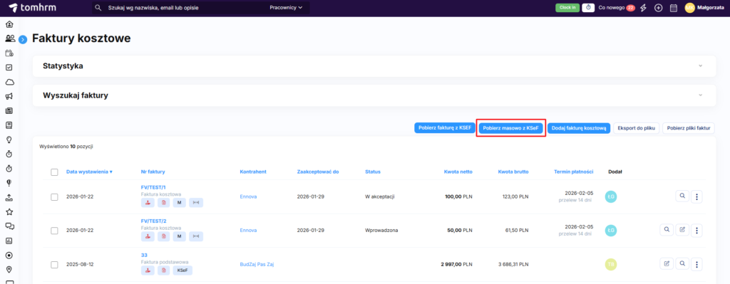 - Możliwość ręcznego uruchomienia pobierania w dowolnym momenciePrzy rozpoczęciu korzystania z KSeF w tomHRM, pierwsze ręczne uruchomienie pobierania, pobiera faktury wstecz z poprzedniego pełnego miesiąca.