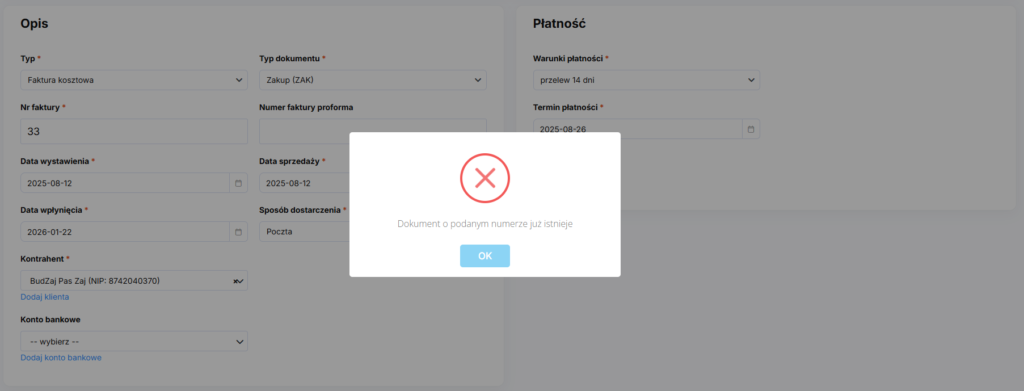 - System automatycznie wykrywa duplikaty sprawdzając numer faktury oraz NIP kontrahenta. Jeśli wykryje, że dokument został najpierw dodany ręcznie, a potem wpłynął do systemu w ramach integracji z KSEF, to oryginalny rekord zostanie nadpisany i otrzyma numer identyfikacyjny KSEF. Jeśli natomiast faktura będzie najpierw dodana w ramach integracji KSEF, a potem użytkownik spróbuje dodać ten sam dokument ręcznie, to system wykryje duplika, pokaże odpowiedni komunikat i nie pozwoli go wprowadzić.