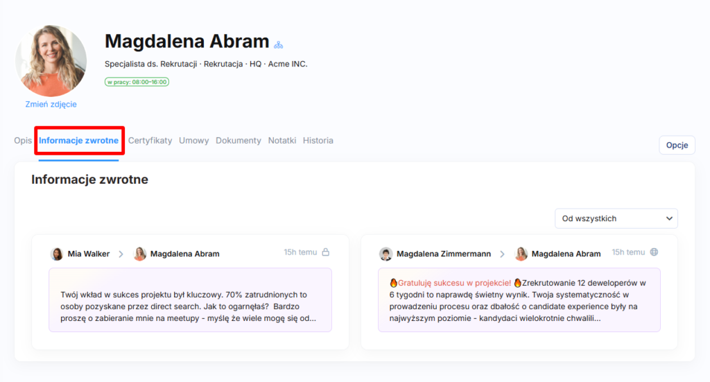 W profilu pracownika istnieje zakładka Informacje Zwrotne, gdzie znajdziesz wszystkie udostępnione Ci informacje zwrotne na Twój temat.