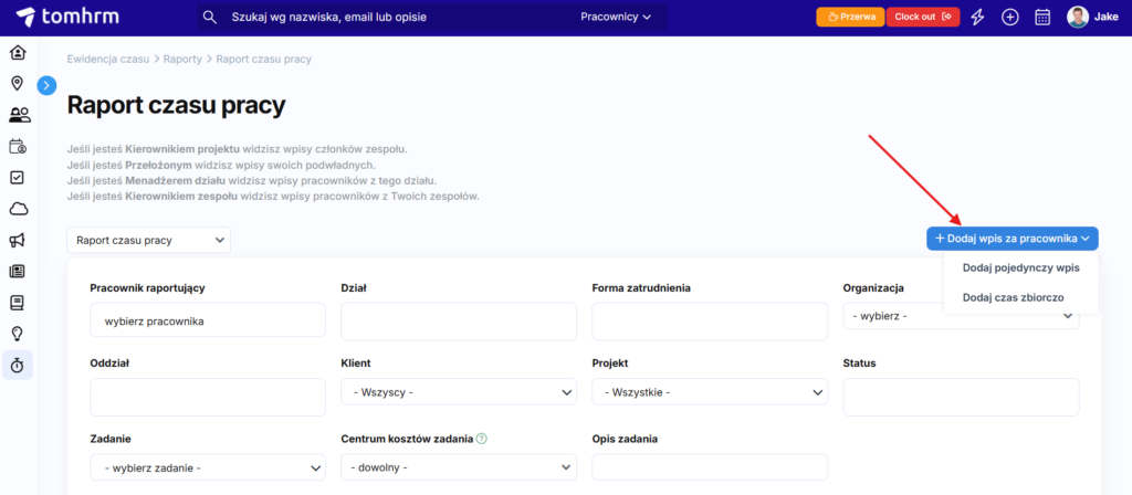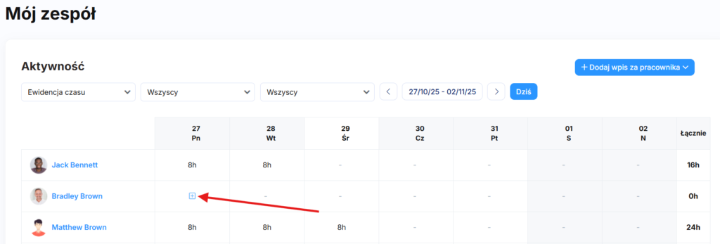 Dodawanie wpisów za pracownika z poziomu raportu ewidencji czasu