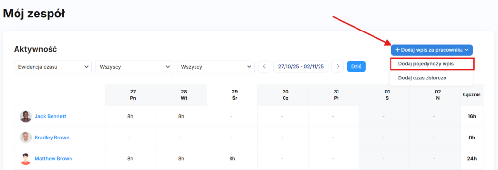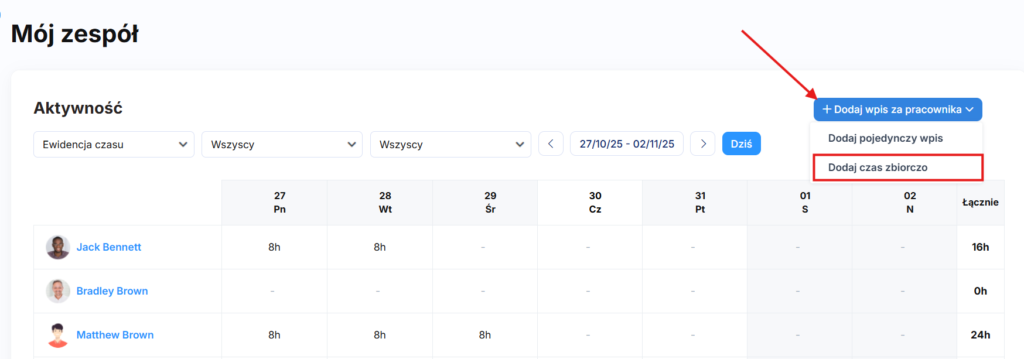Administratorzy mogą też udzielić przełożonym dostępu do zakładki Ewidencja czasu > Raporty. W tym miejscu system prezentuje zestawienie wpisów wszystkich Twoich podwładnych. Jeśli możesz dodawać wpisy za podwładnych i udzielono Ci dostępu do raportu, to funkcja pojedynczego i zbiorczego dodawania danych będzie dostępna dla Ciebie również w tym widoku.