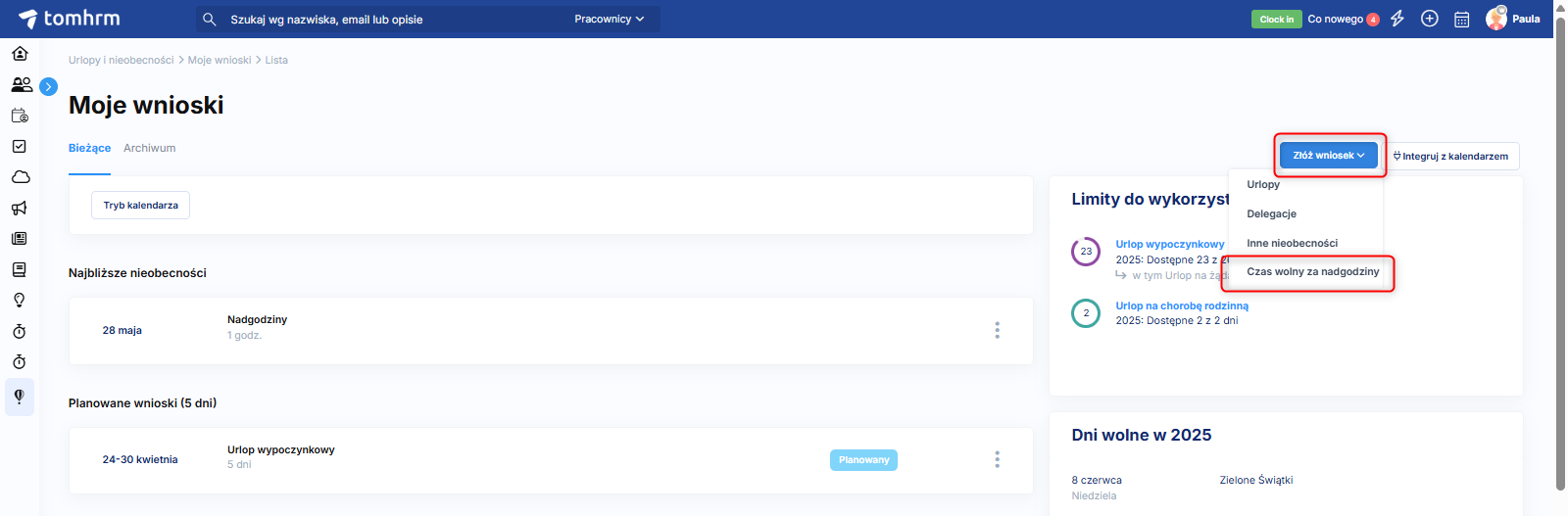 Jeśli posiadasz dostęp do zakładki Urlopy i nieobecności, będziesz mógł/ mogła złożyć wniosek o odbiór dni wolnych za nadgodziny, do dyspozycji mając liczbę godzin widoczną w zielonym kółeczku w