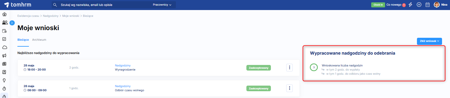 Częściowo. Składając wniosek wskazujesz preferowany sposób odbioru nadgodzin. Ostateczna decyzja o tym, czy za wynagrodzenie będzie wypłacone wynagrodzenie, czy czas wolny należy (według Kodeksu Pracy) do pracodawcy, czyli w praktyce do Twojego przełożonego lub HR. W każdym momencie możesz sprawdzić ile masz nadgodzin do wypłaty a ile do odebrania w zakładce Nadgodziny > Moje wnioski.