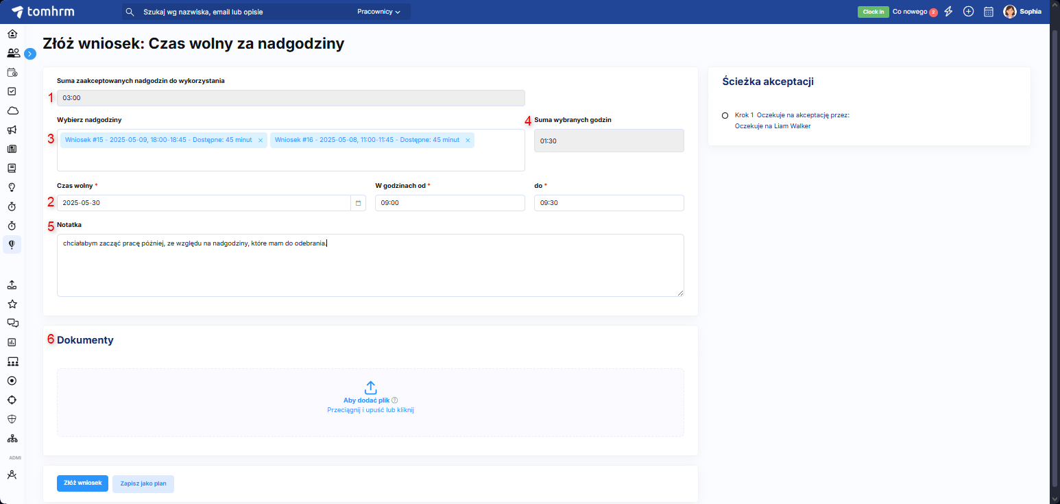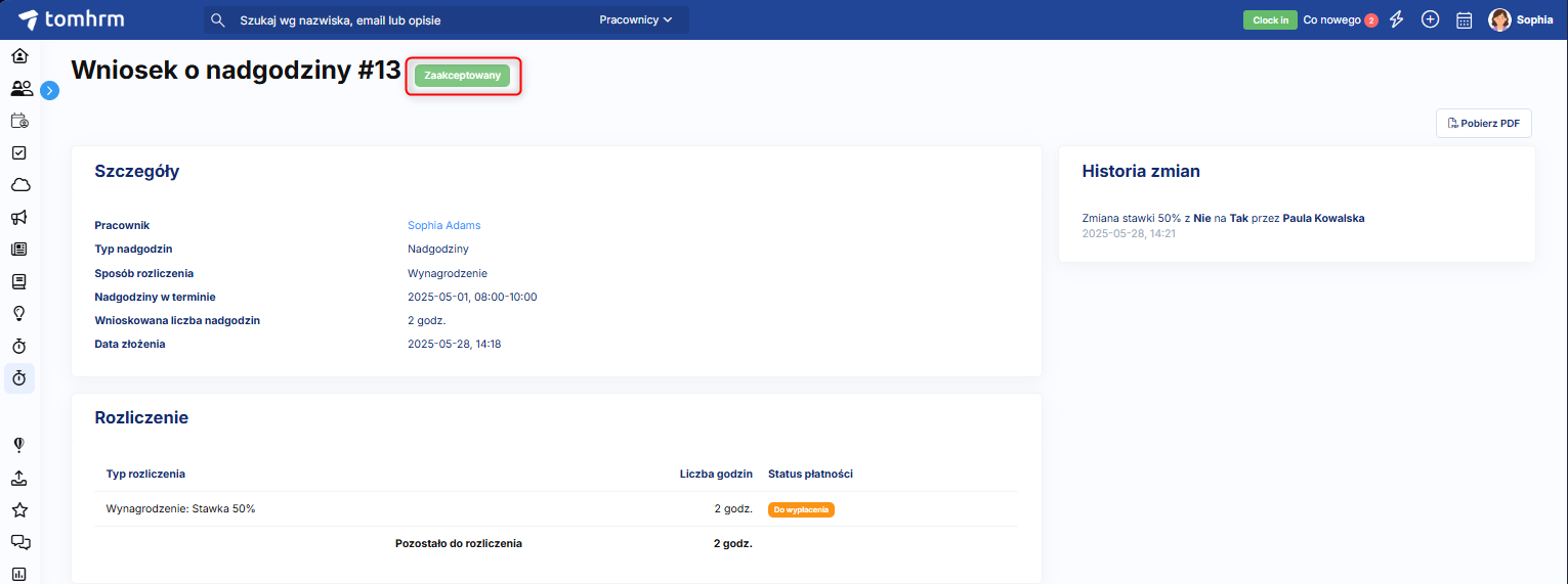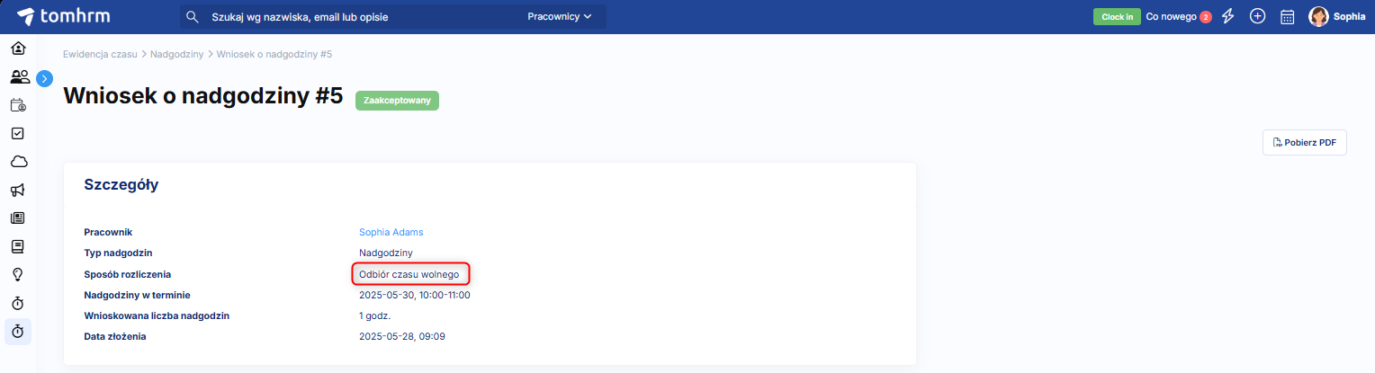 - Jeśli za dane nadgodziny złożyłeś/łaś wniosek o czas wolny, w szczegółach pojawi się jego status