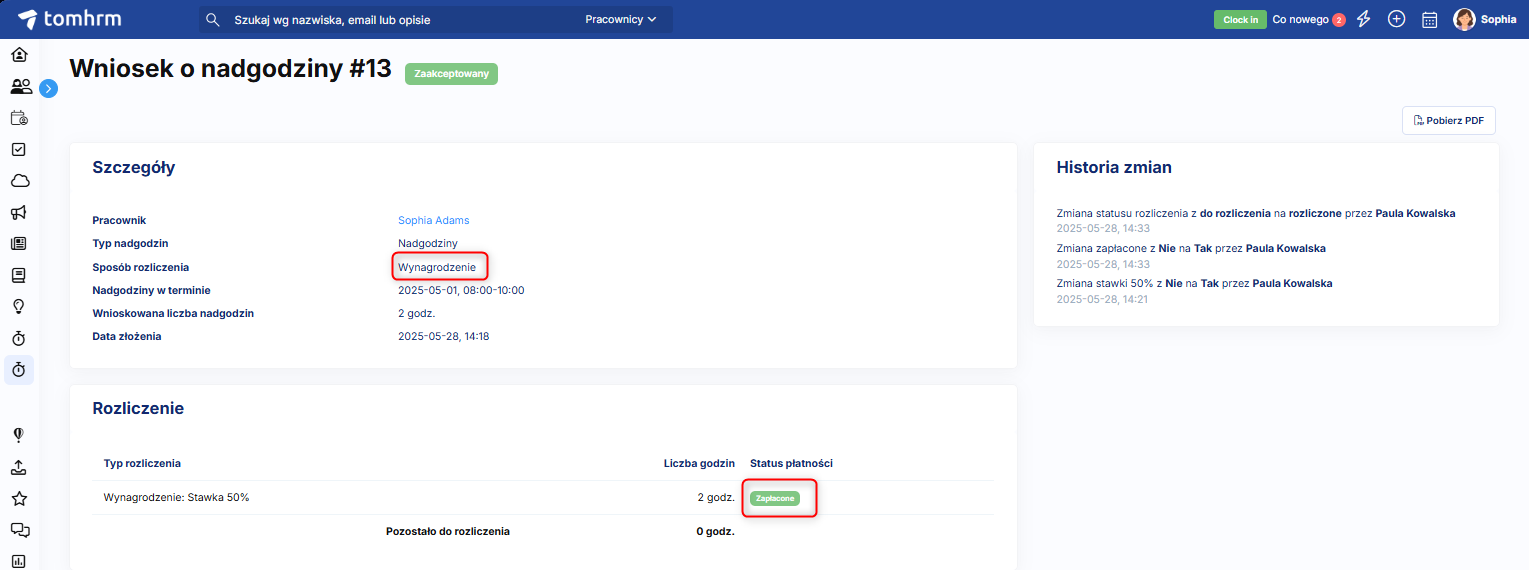 2. Jeśli za dane nadgodziny zostało (lub zostanie) Ci wypłacone wynagrodzenie, w szczegółach pojawi się stosowna informacja: