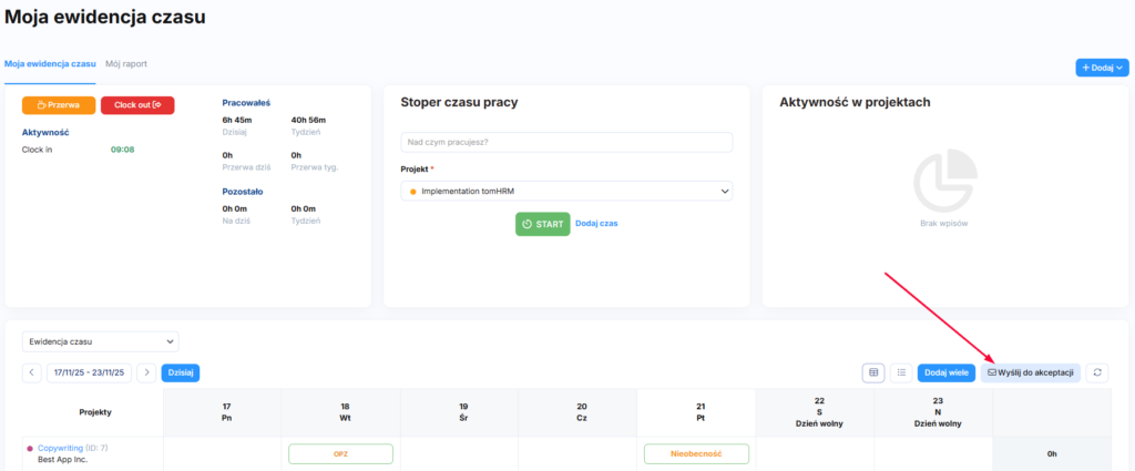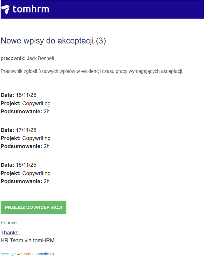 Jeśli Twoja firma wymaga akceptacji czasu pracy, możesz samodzielnie sygnalizować przełożonemu, że Twoje wpisy są już gotowe do sprawdzenia. Jeśli chcesz, możesz to robić na początku miesiąca, gdy zakończysz uzupełnianie danych za miesiąc poprzedni.