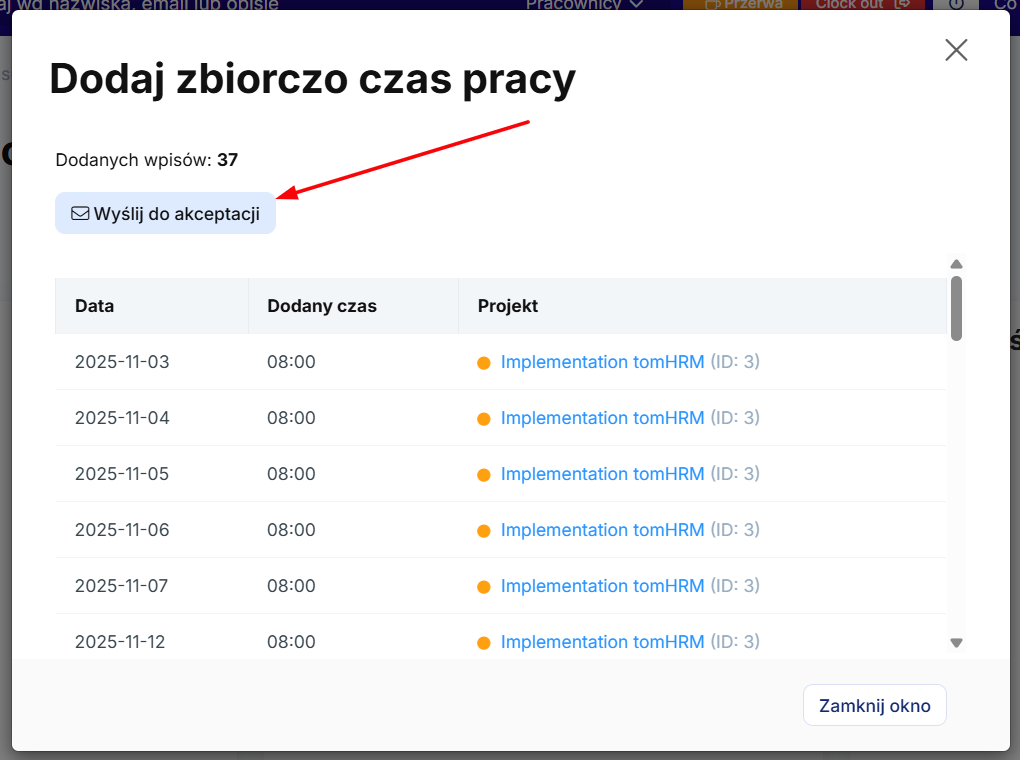 Przycisk jest teraz dostępny również w oknie z podsumowaniem akcji Dodaj zbiorczo. Dzięki temu możesz skorzystać z funkcji masowego dodawania wpisów (https://support.tomhrm.com/kb/masowe-dodawanie-czasu-pracy-w-projektach/) za cały miesiąc z dołu i od razu wysłać do osoby akceptującej.