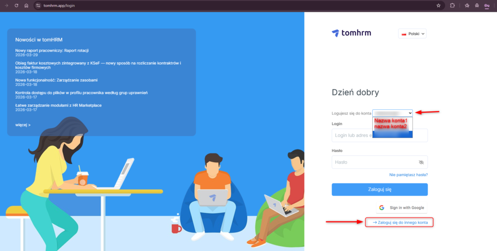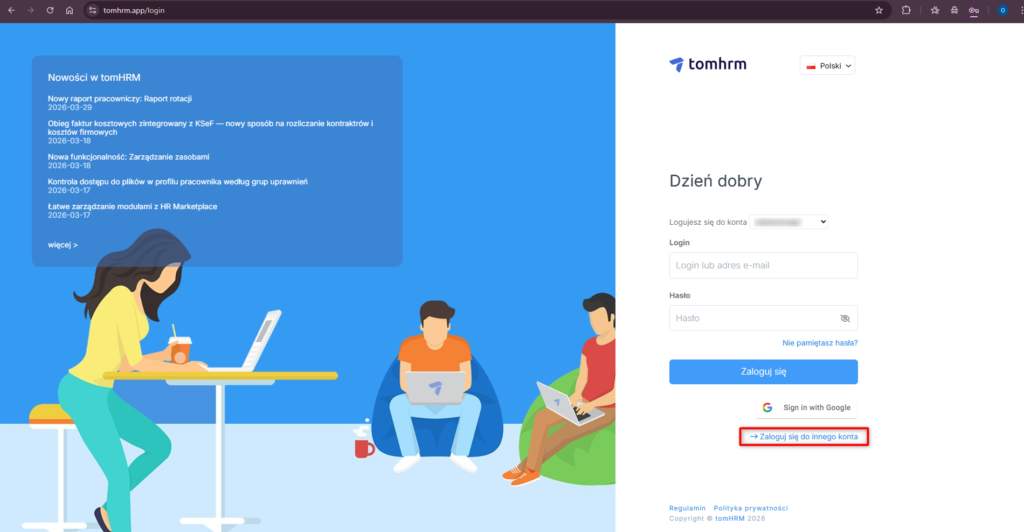 Jeśli korzystasz z kilku kont w tomHRM (np. pracujesz w więcej niż jednej firmie), po pierwszym zalogowaniu system zapamiętuje dostępne konta. Przy kolejnych wizytach na stronie logowania: