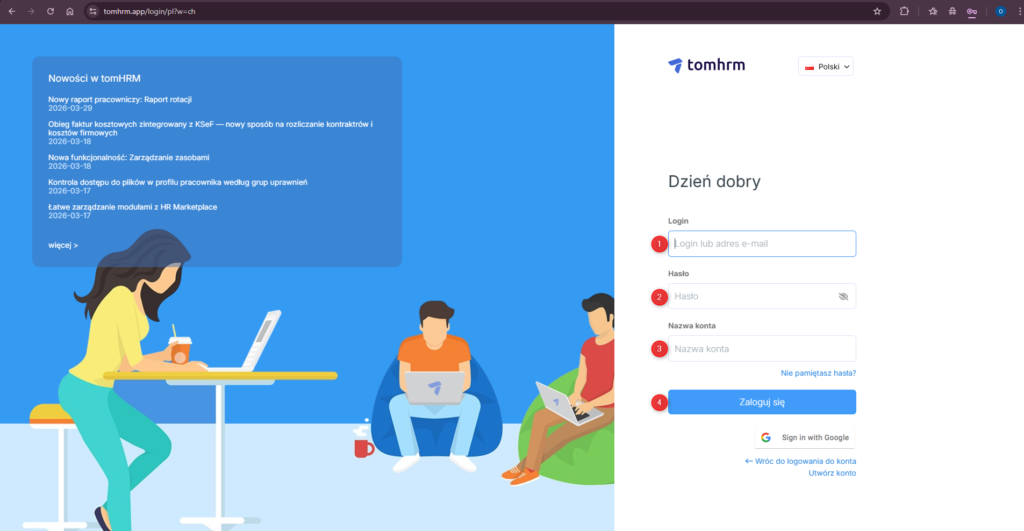 - Wejdź na stronę tomhrm.app/login