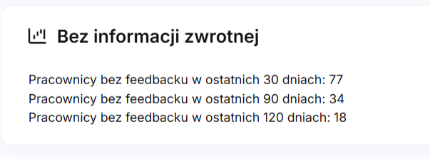 • Monitoring efektywności kultury feedbacku – wysoka liczba pracowników bez feedbacku wskazuje na potrzebę wzmocnienia przekazu o potrzebie feedbacku w organizacji,