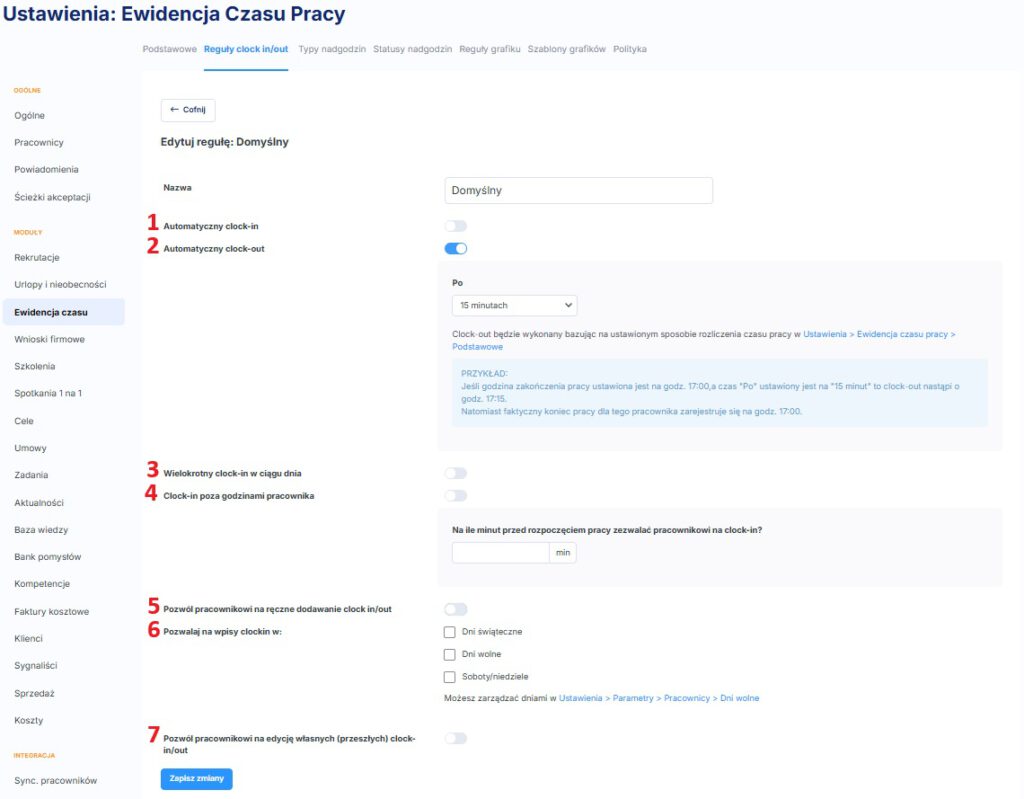 5. Pozwól pracownikowi na ręczne dodawanie clock in/out – włączenie funkcji oznacza pozwolenie pracownikowi na samodzielne, ręczne dodawanie wpisów clock-in/out.