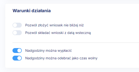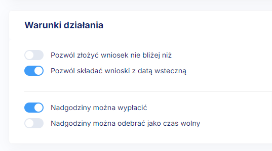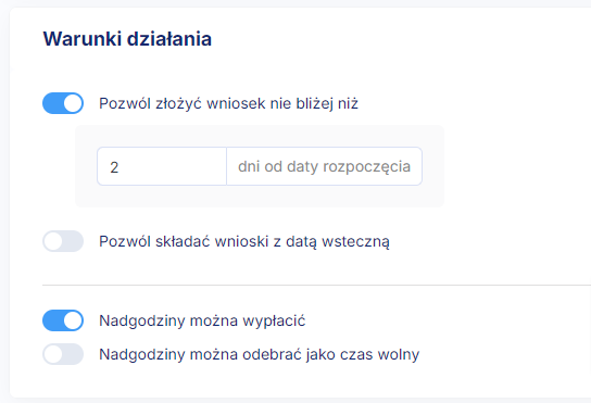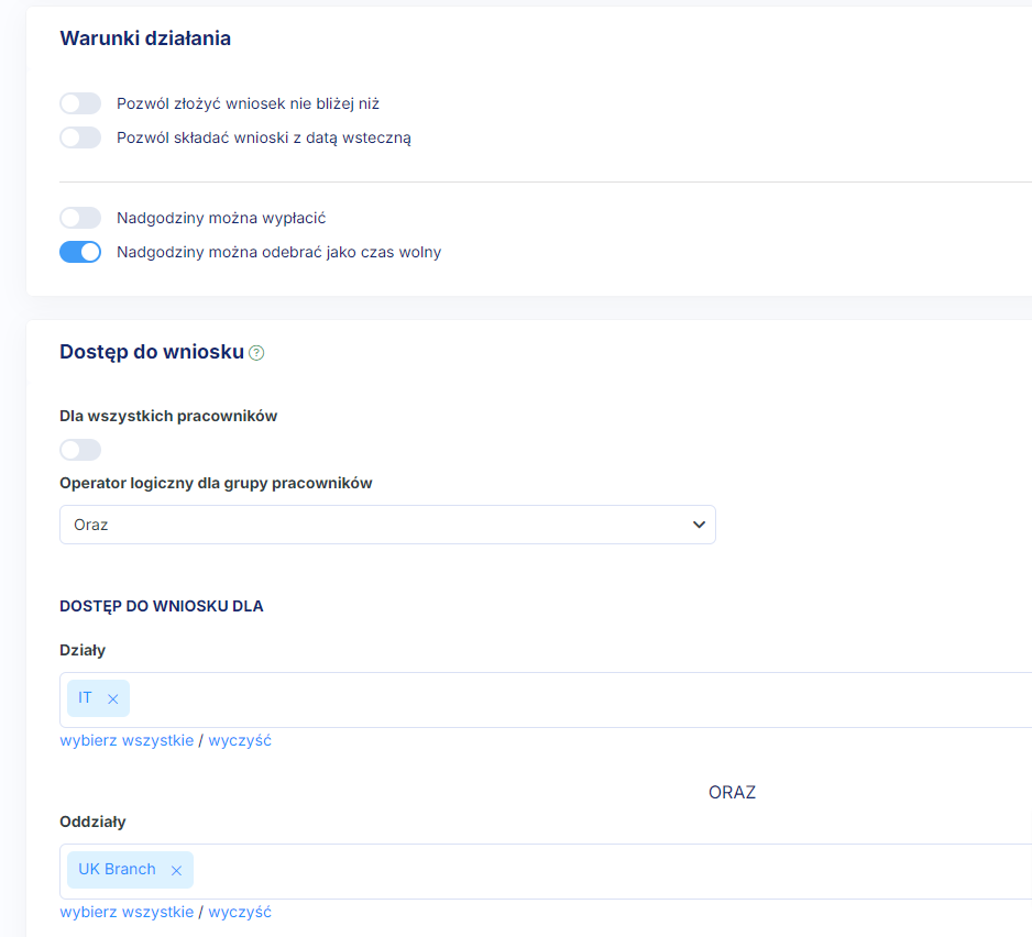 Jeśli chcesz by pracownik mógł składać wnioski o nadgodziny z datą wsteczną, ale aby jednocześnie tego typu nadgodziny były rozliczane jedynie wynagrodzeniem, stwórz wniosek, w którym w warunkach działania umożliwisz datę wsteczną, ale który będzie ograniczony do wypłaty wynagrodzenia. W ten sposób pracownik nie zawnioskuje o nadgodziny po terminie możliwości ich odrobienia w danym okresie rozliczeniowym.