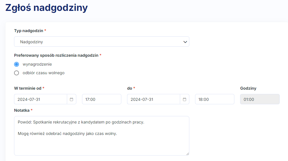 Jeśli w Twojej organizacji polityka nadgodzin zakłada, że pracownik może wybrać preferowaną metodę rozliczenia nadgodzin stwórz wniosek, w którym w wskażesz obie dopuszczalne formy rozliczenia.