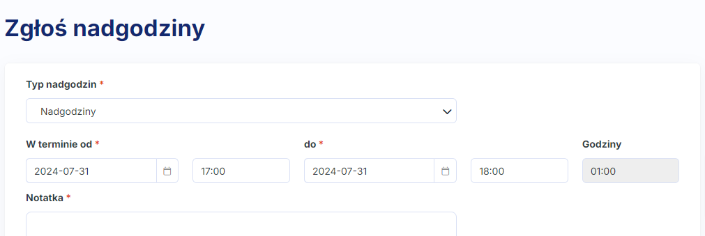 Jednocześnie dla nadgodzin planowanych w przyszłości, możesz stworzyć inny typ wniosku, który będzie można składać z datą nie bliżej niż dzień składania wniosku i w którym pracownik będzie wskazywał preferowaną formę rozliczenia.