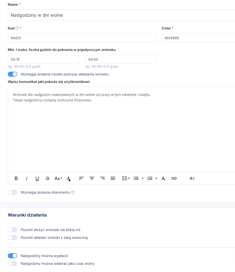 Jeśli chcesz, by pracownicy pracując w nadgodzinach w dni świąteczne, nie mogli odbierać ich dniem wolnym, stwórz analogicznie jak w metodzie 3 dwa typy wniosków, a w komunikacie widocznym dla pracownika umieścić stosowną informację.