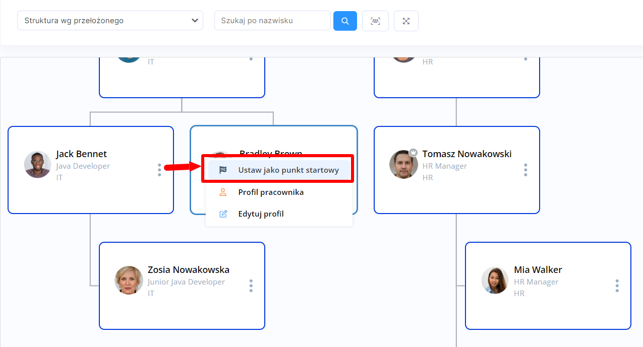 Aby konkretna osoba była zawsze punktem centralnym struktury dla wszystkich pracowników, na schemacie wybierz daną osobę i w menu przy jej nazwisku wybierz . W ten sposób możesz wycentrować widok schematu dla pracowników.