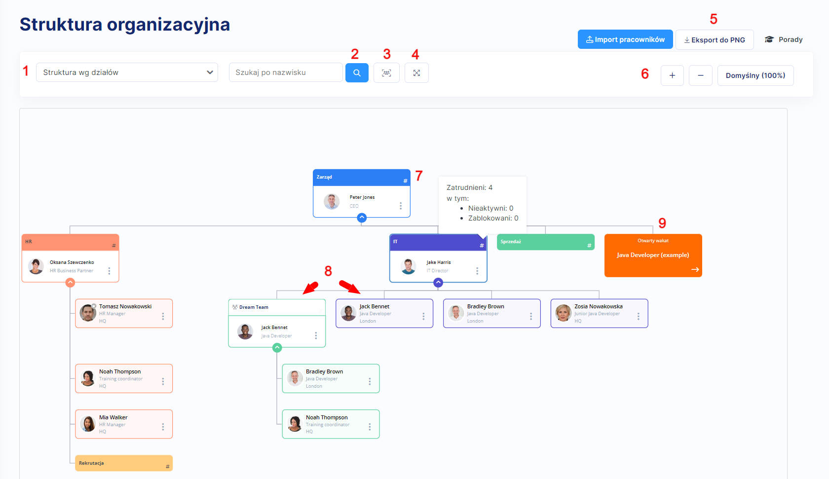 - Każdy pracownik może należeć tylko do jednego działu, ale do wielu zespołów (patrz pkt 8 na widoku informacji na schemacie struktury poniżej). To powoduje, że wizytówka tego samego pracownika może pojawiać się na schemacie kilkukrotnie: jako członka Działu i jako członka Zespołu/ów.