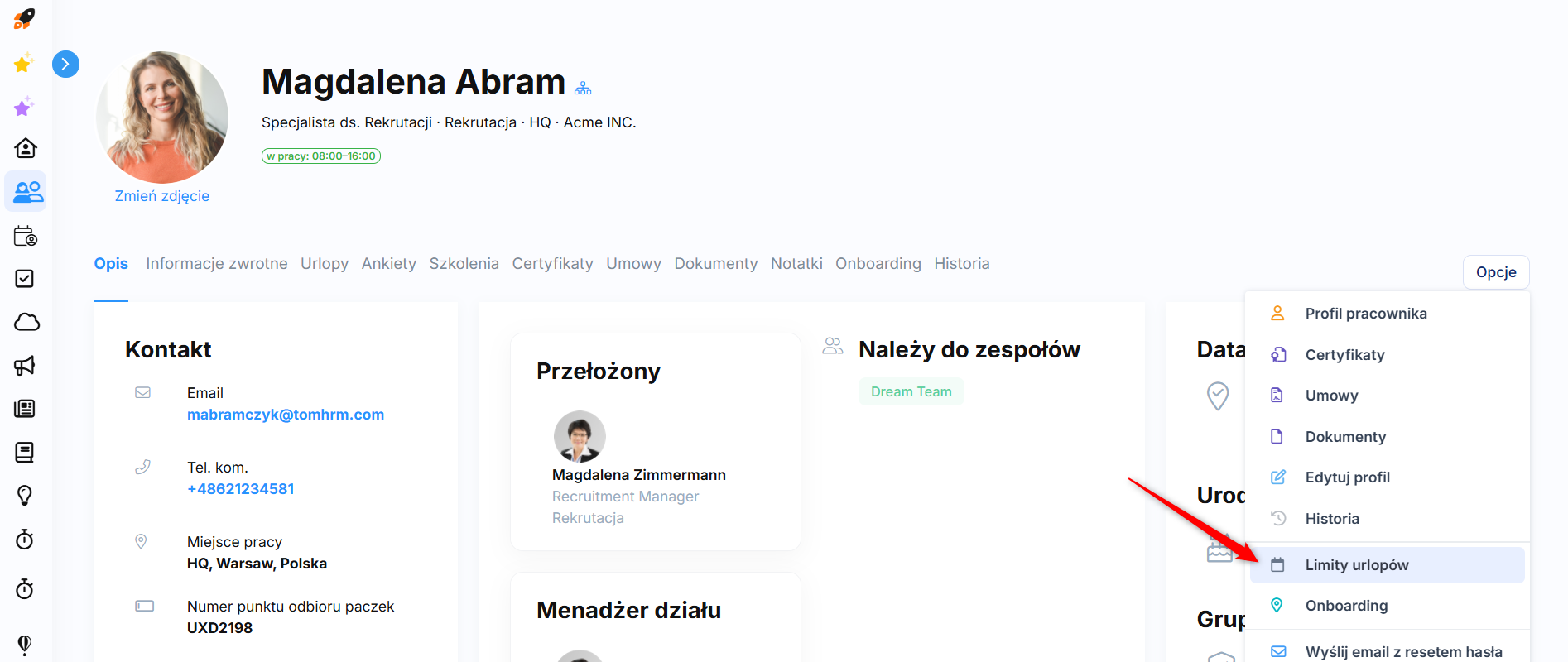 Jeśli masz uprawnienia do zarządzania pulą dni urlopowych danego pracownika, wejdź do edycji profilu pracownika, którego limit chcesz ustawić: