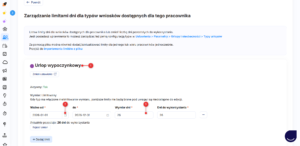 Może mieć limitowany wymiar dni dostępnych dla pracownika. Oznacza to, że pracownikowi będzie przysługiwać tylko określony, nadany mu przez administratora limit dni urlopu danego typu. Więcej o ustawianiu typów urlopów.