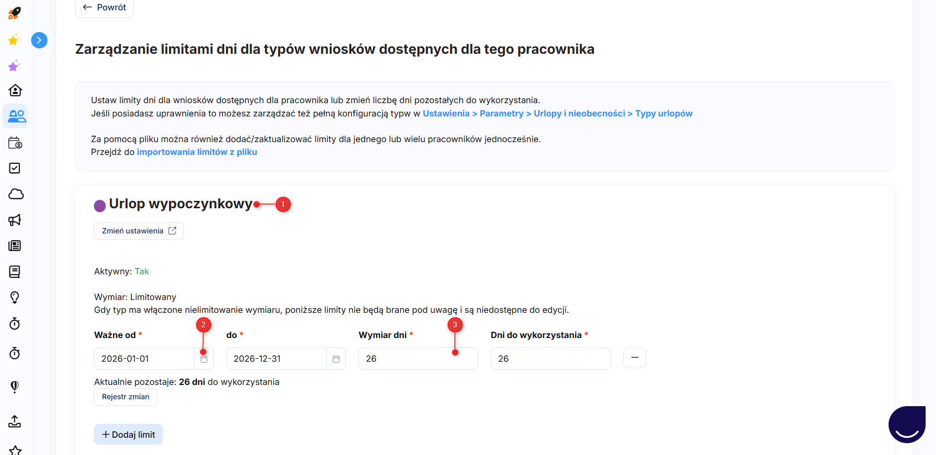 W lewym menu klikamy w zakładkę a następnie przycisk Ustaw limity urlopów.