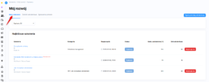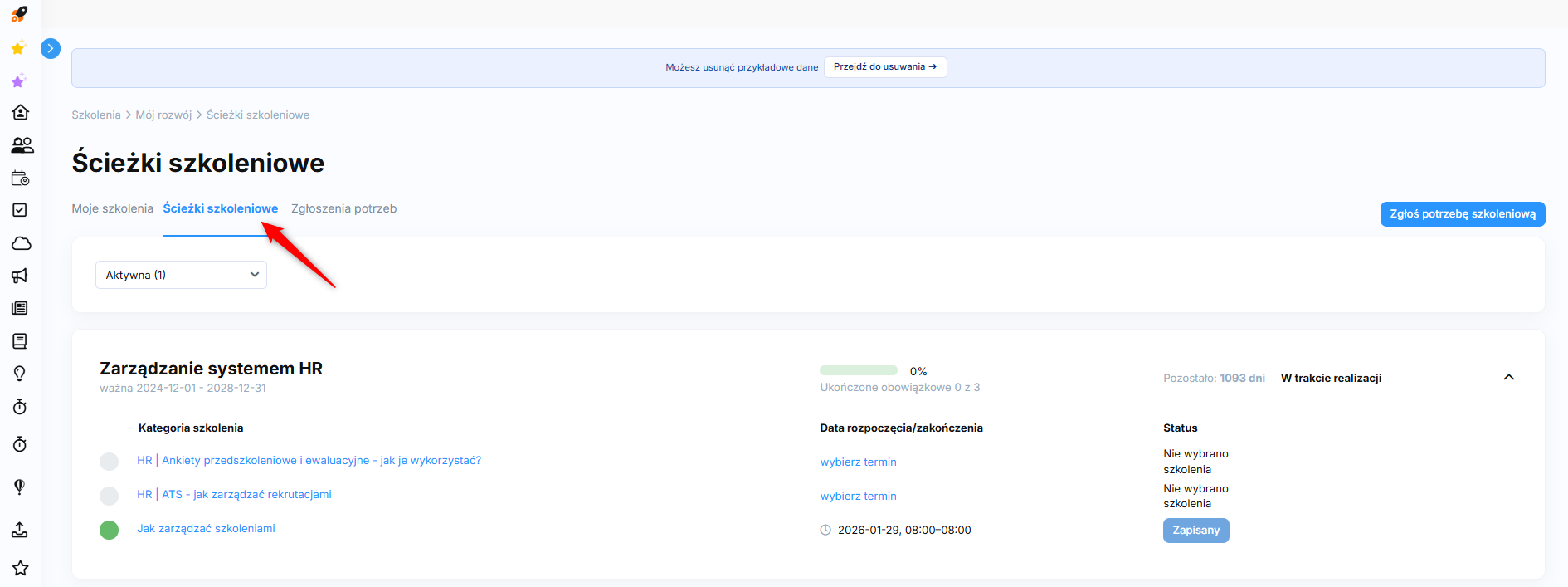 Znajdują się tutaj przypisane programy rozwojowe, które umożliwiają monitorowanie postępów w ich realizacji. Dla każdej ścieżki widoczny jest procent ukończenia, liczba pozostałych dni oraz status poszczególnych modułów. Istnieje możliwość wybierania terminów dla dostępnych szkoleń poprzez kliknięcie w link “wybierz termin” oraz filtrowania ścieżek według ich statusu. Zakładka umożliwia także śledzenie, które moduły zostały już ukończone, które są w trakcie realizacji, a które dopiero czekają na rozpoczęcie.