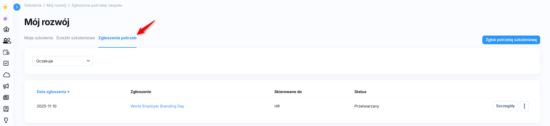 Jest to lista zgłoszeń potrzeb szkoleniowych, które zostały przez ciebie wysłane. Każde zgłoszenie opatrzone jest datą, statusem oraz informacją do kogo zostało skierowane.