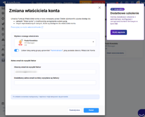 Jeśli osoba pełniąca tę funkcję jest aktywnym użytkownikiem, to może samodzielnie przekazać ją innemu, wybranemu przez siebie pracownikowi, w dowolnym momencie. Żeby to zrobić, właściciel (owner) musi przejść do w lewym menu, a następnie do zakładki Konto i kliknąć w Zmień właściciela konta.