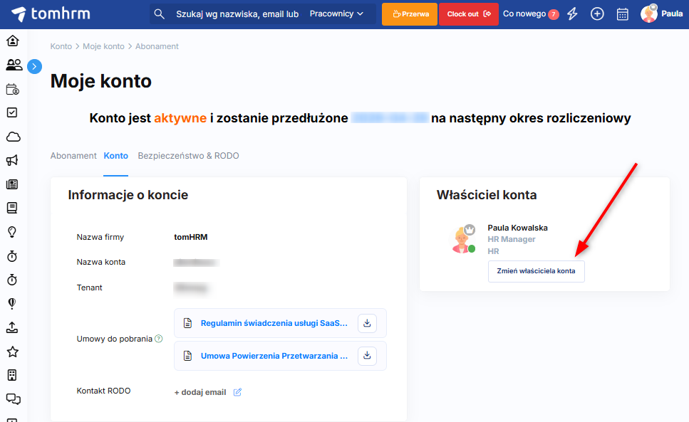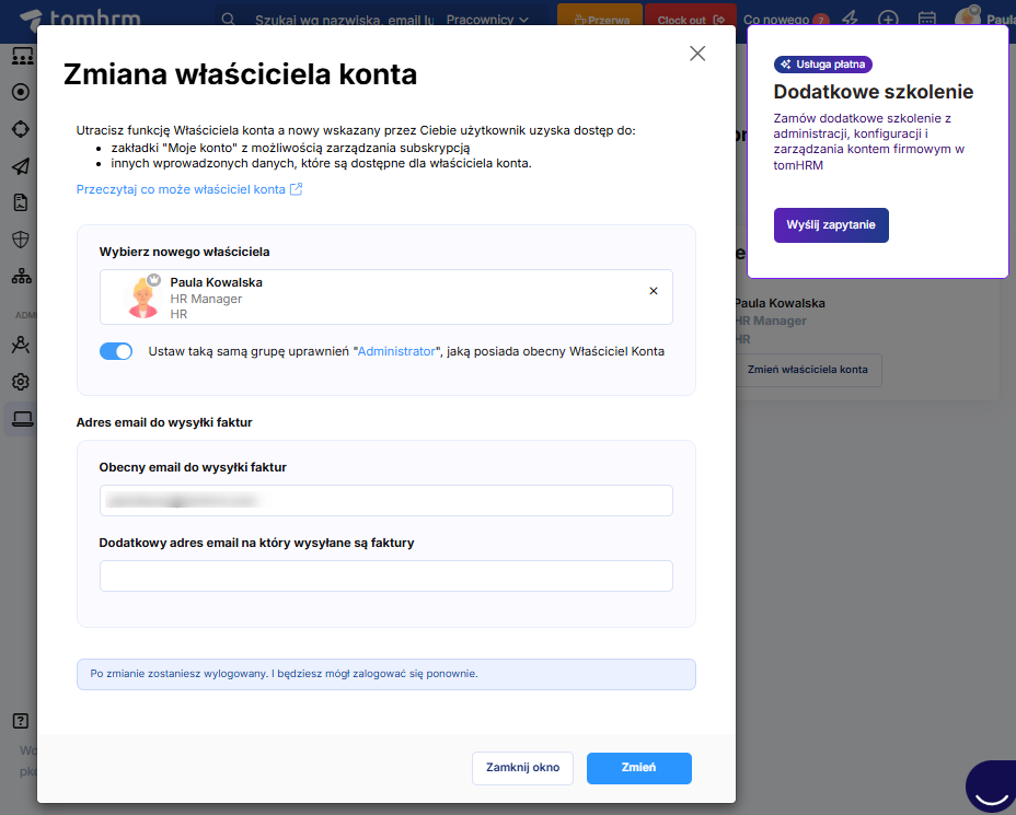 Jeśli osoba, która dotychczas pełniła rolę właściciela konta, nie jest już aktywnym użytkownikiem systemu tomHRM, to zmiany nie będzie można wykonać samodzielnie. W takiej sytuacji zmianę może wprowadzić za klienta nasz zespół supportowy.